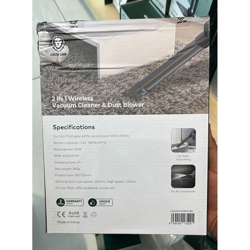 دمنده گرد و غبار گرین مدل GN2IN1VCMDST به صورت تفنگی طراحی شده که هم به صورت مکنده ( جارو شارژی ) و هم به صورت دمنده نیز قابل استفاده است . از این دستگاه می‌توانید برای از بین بردن خاک بر روی سطوح مختلف ، حتی نقاط غیر قابل دسترس استفاده کنید .این دستگاه برای کسانی که در زمینه‌ی تعمیرات وسایل الکترونیکی همچون لپ‌تاپ ، PC و همچنین ماشین و … فعالیت دارند بسیار مناسب است و می‌توانند دستگاه‌های مختلف را از طریق آن سرویس و گرد گیری کنند .یک طرف دستگاه دارای سری باریک است که عملکرد دمنده دارد و یک طرف دیگر دارای سری بزرگ تر است که عملکرد مکنده دارد و با قدرت مکش 5000 پاسکال ، سطوح را از گرد و غبار و ذرات ریز پاکسازی می‌کند .ظرفیت باتری 3600 میلی آمپر ساعت و سرعت موتور 42500 دور دقیقه است و با هربار شارژ کامل ، امکان استفاده از دستگاه را تا 45 دقیقه بدون وقفه فراهم می‌کند .دارای نویز بسیار کمی است و عملکرد بی سر و صدایی نیز دارد .