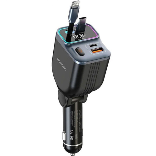 شارژر فندکی Porodo 65W Dual Retractable Cable یک دستگاه قدرتمند و چندمنظوره برای شارژ هم‌زمان چند گجت در حین حرکت است. با ورودی DC 12V/24V، این شارژر قابل استفاده در انواع خودروها می‌باشد. این محصول دارای کابل Type-C داخلی است که از شارژ سریع با توان 65 وات (در 24 ولت) و 36 وات (در 12 ولت) پشتیبانی می‌کند تا دستگاه‌های سازگار شما را با سرعت بالا شارژ کند. علاوه بر آن، کابل Lightning با توان 12 وات (5V/2.4A) و همچنین درگاه‌های USB-C و USB-A هرکدام با توان خروجی 18 وات (5V/3.6A) برای شارژ گوشی موبایل و سایر دستگاه‌ها در دسترس هستند. دو کابل جمع‌شونده 80 سانتی‌متری باعث نظم بیشتر و سهولت استفاده می‌شوند و نور LED محیطی نیز جلوه‌ای زیبا به شارژر می‌بخشد. با توجه به سازگاری گسترده با انواع دستگاه‌ها، این شارژر شما را در سفرهای طولانی همیشه متصل و شارژ نگه می‌دارد. این محصول انتخابی ایده‌آل برای افرادی است که به شارژ سریع، مطمئن و کارآمد در هنگام سفر نیاز دارند.