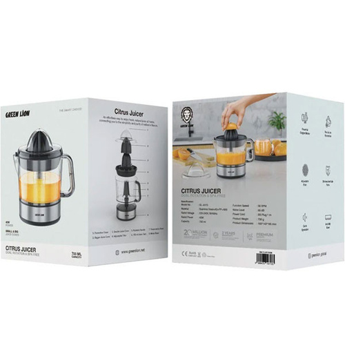 آبمیوه‌گیری مرکبات گرین لیون 700 میلی‌لیتری، ترکیبی شیک و مقاوم با سرعت و کارایی ایده‌آل در تهیه آبمیوه است. این دستگاه با قطعات بادوامی مانند استیل ضد زنگ، AS، PP و ABS ساخته شده است که آن را بسیار قوی و بدون BPA می‌کند تا در هر بار استفاده، آبمیوه‌گیری ایمن و سالمی داشته باشید. این آبمیوه‌گیری با موتور مسی محکم، دارای قابلیت آبگیری فوری با سرعت قدرتمند 56 دور در دقیقه است و با صدای کرکننده 65 دسی‌بل، بی‌صدا کار می‌کند. ظرفیت ذخیره‌سازی 700 میلی‌لیتر آبمیوه توسط این آبمیوه‌گیری فراهم شده است و دارای چرخش دو طرفه برای دستیابی به حداکثر بازده آبمیوه‌گیری است، همچنین امکان ذخیره مخروط‌های آبمیوه کوچک و بزرگ برای نگهداری میوه‌های مختلف وجود دارد. همچنین قابلیت تنظیم فیلتر برای کنترل میزان تفاله وجود دارد و قابل شستشو در ماشین ظرفشویی است، بنابراین استفاده از آن راحت خواهد بود. یک پایه ضد لغزش برای پایداری در هنگام استفاده ایمن و یک سیم برق 1 متری با دوشاخه BS برای قرار دادن آسان وجود دارد. آبمیوه‌گیری مرکبات گرین لاین، با ولتاژ 220-240 ولت و توان 40 وات، یک راه‌حل جمع‌وجور و مسطح برای تهیه آبمیوه تازه در خانه است.